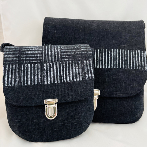 Jag älskar lin av många skäl, strukturen, känslan och hur färgerna fungerar tillsammans. Väskorna finns i olika storlekar - stora, små och som ryggsäck. Jag trycker olika mönster på varje tillklippt del separat och syr dem sedan.